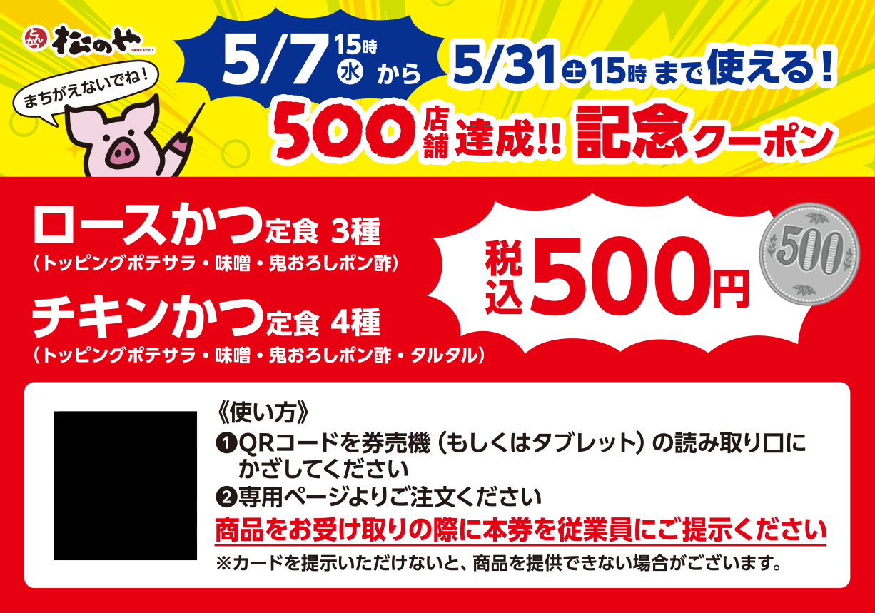 とんかつ専門店「松のや」は、まもなくとんかつ業態が500店舗を達成することを記念して、特別なクーポンを配布します。​